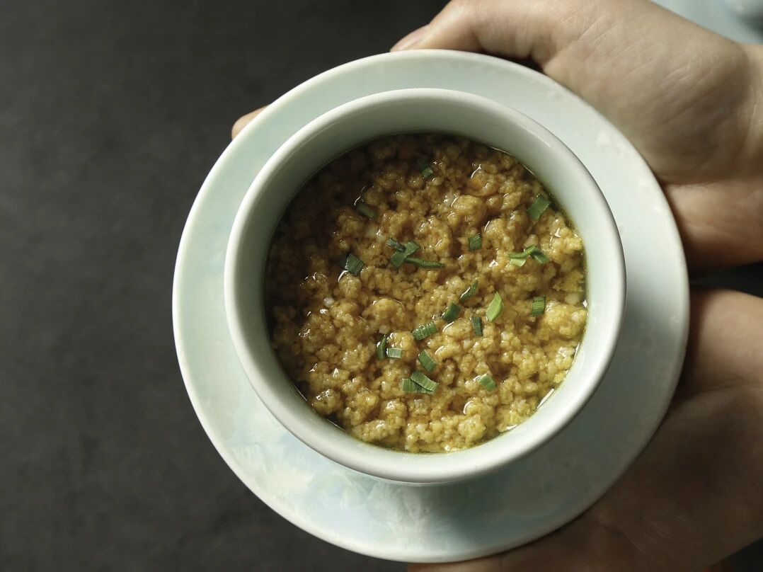 晶莹剔透却不失弹韧的饺子皮里,金灿灿的海胆馅若隐若现。咬破的瞬间,滚烫鲜甜的汁水直冲脑门,海胆的鲜甜混合着油润的肉香在口中奔涌。
